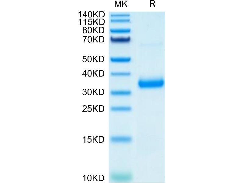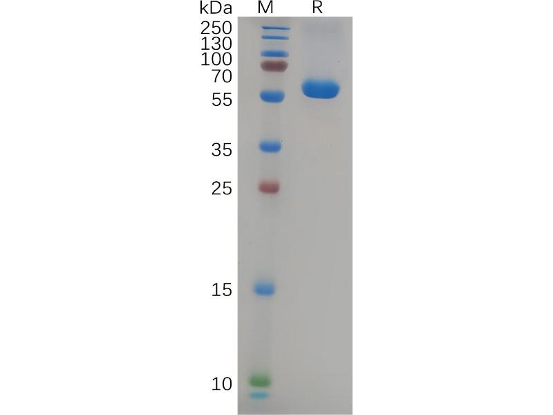 The purity of the protein is greater than 90 % as determined by SDS-PAGE and Coomassie blue staining.