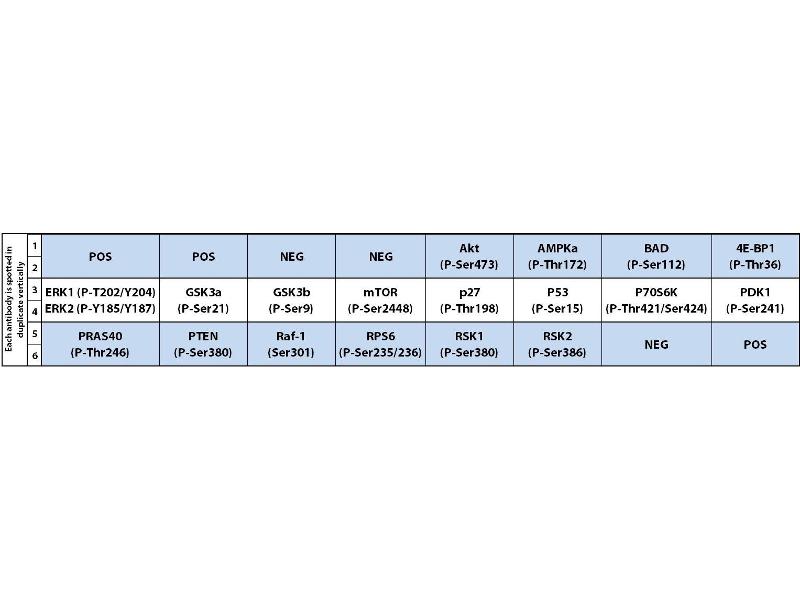 - Akt (P-Ser473) (PKB (P-Ser473)), AMPKa (P-Thr172), BAD (P-Ser112), 4E-BP1 (P-Thr36), ERK1 (P-T202/Y204)/ERK2 (P-Y185/Y187), GSK3a (P-Ser21), GSK3b (P-Ser9), mTOR (P-Ser2448), p27 (P-Thr198), P53 (P-Ser15), P70S6K (P-Thr421/Ser424), PDK1 (P-S241), PRAS40 (P-Thr246), PTEN (P-Ser380), Raf-1 (Ser301), RPS6 (P-Ser235/Ser236), RSK1 (P-Ser380), RSK2 (P-Ser386)