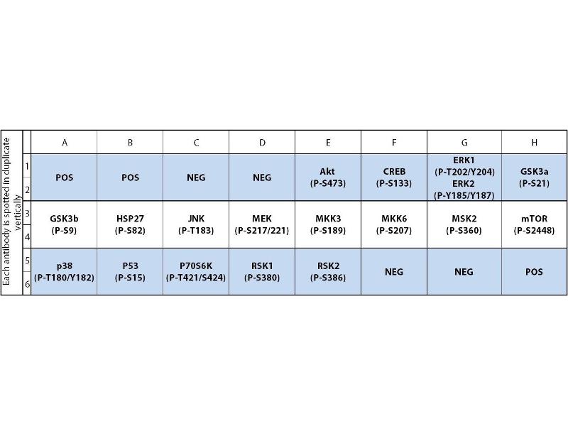 - Akt (P-Ser473), CREB (P-Ser133), ERK1 (P-T202/Y204)/ERK2 (P-Y185/Y187), GSK3a (P-Ser21), GSK3b (P-Ser9), HSP27 (P-Ser82), JNK (P-Thr183), MEK (P-Ser217/Ser221), MKK3 (P-Ser189), MKK6 (P-Ser207), MSK2 (P-Ser360), mTOR (P-Ser2448), p38 (P-Thr180/Tyr182), P53 (P-Ser15), P70S6K (P-Thr421/Ser424), RSK1 (P-Ser380), RSK2 (P-Ser386)