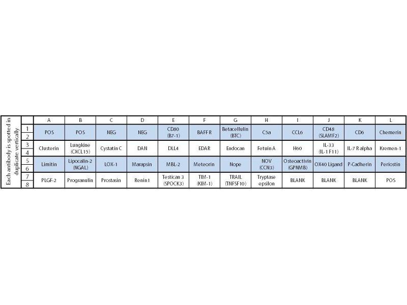 - CD80 (B7-1), BAFF R, Betacellulin (BTC), C5a, CCL6, CD48 (SLAMF2), CD6, Chemerin, Clusterin, Lungkine (CXCL15), Cystatin C, DAN, DLL4, EDAR, Endocan, Fetuin A, H60, IL-33 (IL-1 F11), IL-7 R alpha, Kremen-1, Limitin, Lipocalin-2 (NGAL), LOX-1, Marapsin, MBL-2, Meteorin, Nope, NOV (CCN3), Osteoactivin (GPNMB), OX40 Ligand, P-Cadherin, Periostin, PLGF-2, Progranulin, Prostasin, Renin 1, Testican 3 (SPOCK3), TIM-1 (KIM-1), TRAIL (TNFSF10), Tryptase epsilon