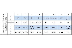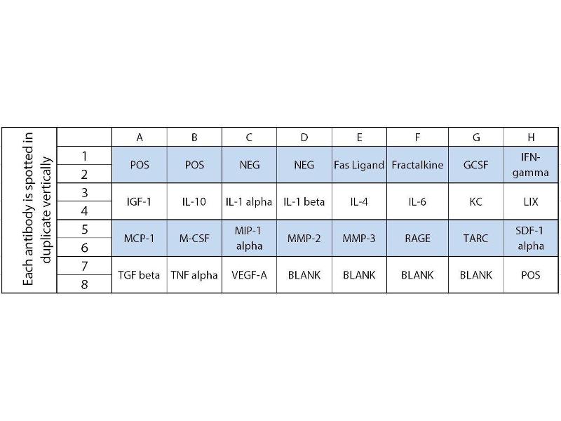 - Fas Ligand (TNFSF6), Fractalkine (CX3CL1), GCSF, IFN-gamma, IGF-1, IL-10, IL-1 alpha (IL-1 F1), IL-1 beta (IL-1 F2), IL-4, IL-6, KC (CXCL1), LIX, MCP-1 (CCL2), M-CSF, MIP-1 alpha (CCL3), MMP-2, MMP-3, RAGE, TARC (CCL17), SDF-1 alpha (CXCL12 alpha), TGF beta 1, TNF alpha, VEGF-A