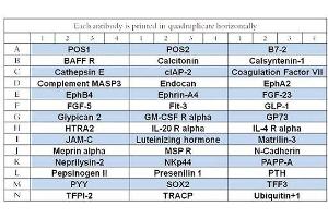 - BAFF R, Calcitonin, Calsyntenin-1 (Alcadein-alpha), Cathepsin E, CD86 (B7-2), cIAP-2, Coagulation Factor VII, Complement MASP3, Endocan, EphA2, EphB4, Ephrin-A4, FGF-23, FGF-5, Flt-3 (Flk-2), GLP-1 (7-36a), Glypican 2, GM-CSF R alpha, GOLM1 (GP73), HTRA2, IL-20 R alpha, IL-4 R alpha, JAM-C (CD323), Luteinizing hormone, Matrilin-3, Meprin alpha, MSP Receptor (Ron), N-Cadherin (Cadherin-2), Neprilysin-2 (MMEL1), NKp44, PAPP-A, Pepsinogen 2, Presenilin 1, PTH, PYY, SOX2, TFF3 (Trefoil Factor 3), TFPI-2, TRACP (PAP/ACP5), Ubiquitin+1