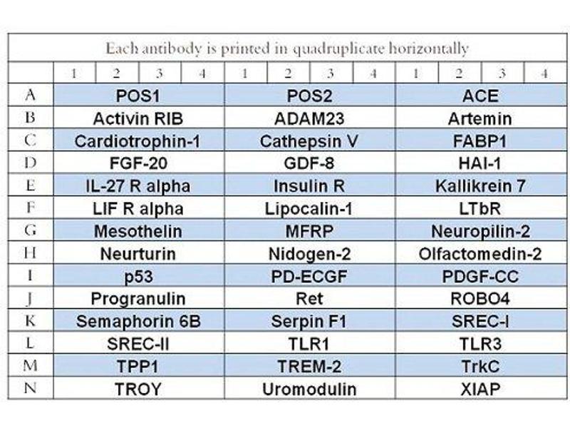 - ACE (CD143), Activin R1B (ALK-4), ADAM23, Cardiotrophin-1 (CT-1), CD23, FABP1, GDF-8 (Myostatin), HAI-1, HIF-1 alpha, IL-27, IL-27 R alpha, Insulin R (CD220), LIF R alpha, Lipocalin-1, LRP-6, Lymphotoxin beta R (TNF RIII), Mesothelin, MFRP, Neuropilin-2, Neurturin, Nidogen-2, NRG1-alpha (HRG1-alpha), Olfactomedin-2 (Noelin-2), p53, PD-ECGF (Thymidine Phosphorylase), PDGF-C, Progranulin, RET (P-Tyr), ROBO4, Semaphorin 6B, SERPINF1 (PEDF), SREC-I (SCARF1), SREC-II (SCARF2), TLR1, TLR3, TREM-2, Tripeptidyl-peptidase I (TPP1), TRKC, TROY (TNFRSF19), XIAP
