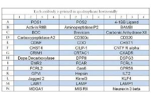 - 4-1BB Ligand (TNFSF9), Activin R2B (ACVR2B), Aminopeptidase P2 (XPNPEP2), BAMBI (NMA), BOC (Brother of CDO), Brevican, CA12, Carboxypeptidase A2 (CPA2), CD300c (CLM-6), CD320 (TCblR/8D6A), CDNF, CDO, CHST1 (GST-1), CHST4 (GST-3), CILP-1, CNTF R alpha, CRIM1, CRTAC1, CXADR, Dopa Decarboxylase (DDC), DPPII (QPP/DPP7), DSPG3, EMR2, FCAR (CD89), FCRL1 (FcRH1), FCRL2 (FcRH2), Gas 6, GPR56, GPVI, Hepsin, ILT-2 (LIR-1/CD85j), Jagged 2, KIRREL3 (NEPH2), KLF4, LAIR1, LAMP (LSAMP), LAMP1 (CD107a), MDGA1, MIS RII (AMHR2), Neurexin-3 beta (NRXN3)