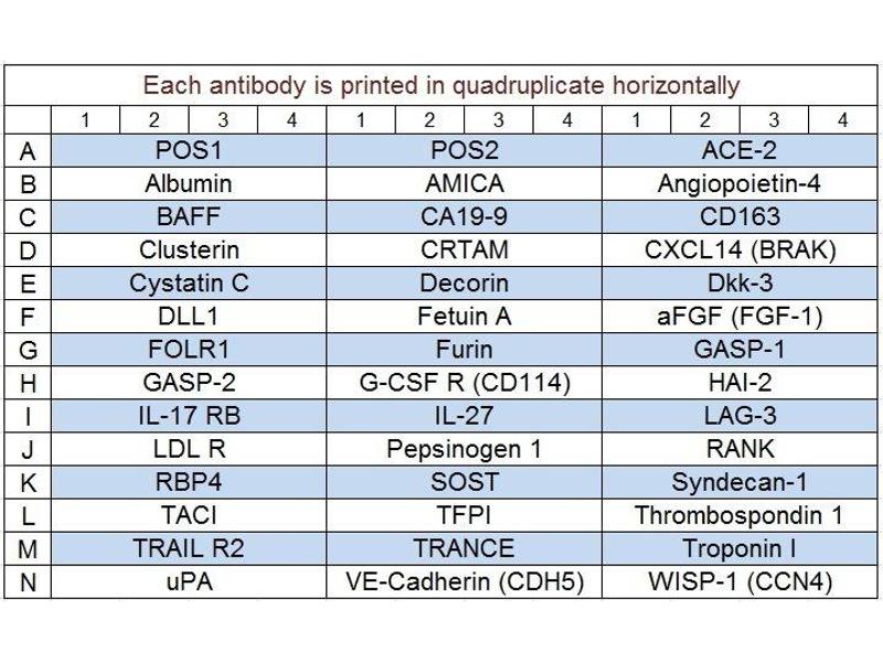 - ACE-2, aFGF (FGF-1), Albumin, AMICA, Angiopoietin-4, BAFF, CA19-9, CD163, Clusterin, CRTAM, CXCL14 (BRAK), Cystatin C, Decorin, Dkk-3, DLL1, Fetuin A, FOLR1, Furin, GASP-1 (WFIKKNRP), GASP-2 (WFIKKN), GCSF R (CD114), HAI-2, IL-17 RB, IL-27, LAG-3, LDL R, Pepsinogen 1, RANK (TNFRSF11A), RBP4, SOST, Syndecan-1, TACI (TNFRSF13B), TFPI, Thrombospondin 1, TRAIL R2 (TNFRSF10B/DR5), TRANCE (TNFSF11), Troponin I, uPA, VE-Cadherin (CDH5), WISP-1 (CCN4)