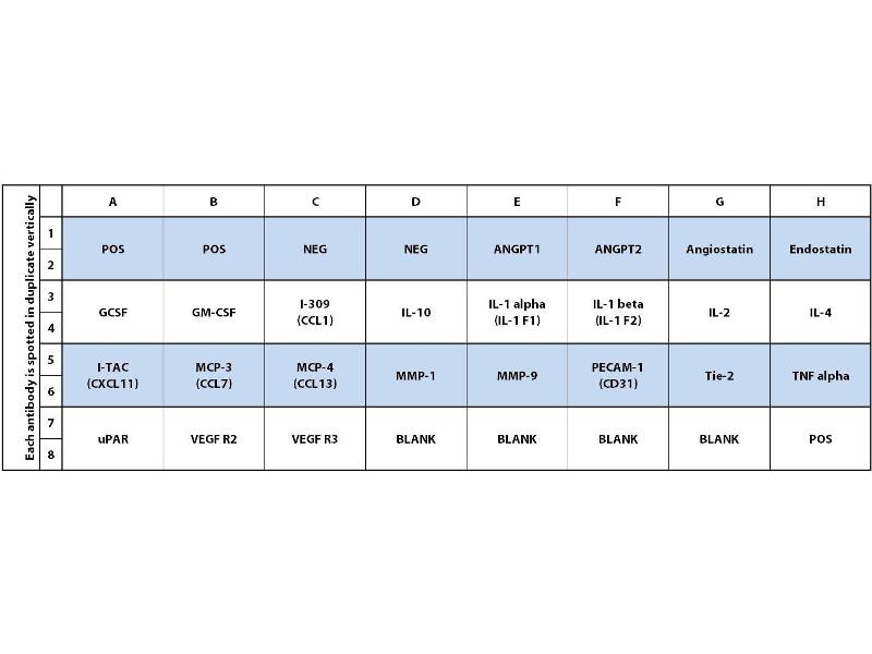 - Angiopoietin-1, Angiopoietin-2, Angiostatin, Endostatin, GCSF, GM-CSF, I-309 (TCA-3/CCL1), IL-10, IL-1 alpha (IL-1 F1), IL-1 beta (IL-1 F2), IL-2, IL-4, I-TAC (CXCL11), MCP-3 (MARC/CCL7), MCP-4 (CCL13), MMP-1, MMP-9, PECAM-1 (CD31), Tie-2, TNF alpha, uPAR, VEGFR2, VEGFR3