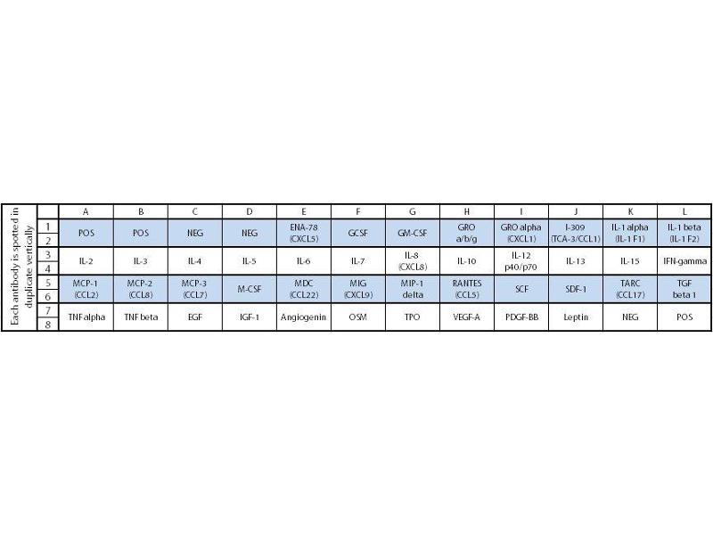 - ENA-78 (CXCL5), GCSF, GM-CSF, GRO alpha/beta/gamma, GRO alpha (CXCL1), I-309 (TCA-3/CCL1), IL-1 alpha (IL-1 F1), IL-1 beta (IL-1 F2), IL-2, IL-3, IL-4, IL-5, IL-6, IL-7, IL-8 (CXCL8), IL-10, IL-12 p40/p70, IL-13, IL-15, IFN-gamma, MCP-1 (CCL2), MCP-2 (CCL8), MCP-3 (MARC/CCL7), M-CSF, MDC (CCL22), MIG (CXCL9), MIP-1 delta (CCL15), RANTES (CCL5), SCF, SDF-1 alpha (CXCL12 alpha), TARC (CCL17), TGF beta 1, TNF alpha, TNF beta (TNFSF1B), EGF, IGF-1, Angiogenin, Oncostatin M, Thrombopoietin (TPO), VEGF-A, PDGF-BB, Leptin