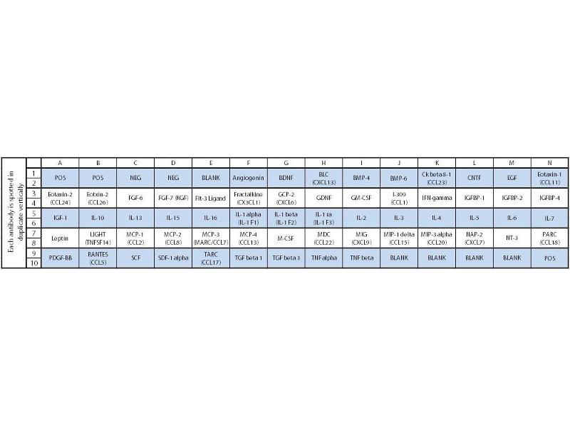 - Angiogenin, BDNF, BLC (CXCL13), BMP-4, BMP-6, Ck beta 8-1 (CCL23), CNTF, EGF, Eotaxin-1 (CCL11), Eotaxin-2 (MPIF-2/CCL24), Eotaxin-3 (CCL26), FGF-6, FGF-7 (KGF), Flt-3 Ligand, Fractalkine (CX3CL1), GCP-2 (CXCL6), GDNF, GM-CSF, I-309 (TCA-3/CCL1), IFN-gamma, IGFBP-1, IGFBP-2, IGFBP-4, IGF-1, IL-10, IL-13, IL-15, IL-16, IL-1 alpha (IL-1 F1), IL-1 beta (IL-1 F2), IL-1 ra (IL-1 F3), IL-2, IL-3, IL-4, IL-5, IL-6, IL-7, Leptin, Light (TNFSF14), MCP-1 (CCL2), MCP-2 (CCL8), MCP-3 (MARC/CCL7), MCP-4 (CCL13), M-CSF, MDC (CCL22), MIG (CXCL9), MIP-1 delta (CCL15), MIP-3 alpha (CCL20), NAP-2 (PPBP/CXCL7), NT-3, PARC (CCL18), PDGF-BB, RANTES (CCL5), SCF, SDF-1 alpha (CXCL12 alpha), TARC (CCL17), TGF beta 1, TGF beta 3, TNF alpha, TNF beta (TNFSF1B)