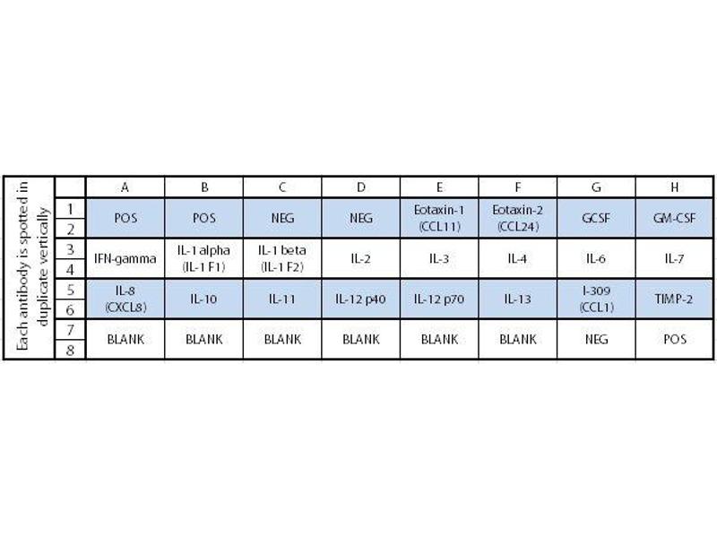 - Eotaxin-1 (CCL11), Eotaxin-2 (MPIF-2/CCL24), GCSF, GM-CSF, IFN-gamma, IL-1 alpha (IL-1 F1), IL-1 beta (IL-1 F2), IL-2, IL-3, IL-4, IL-6, IL-7, IL-8 (CXCL8), IL-10, IL-11, IL-12 p40, IL-12 p70, IL-13, I-309 (TCA-3/CCL1), TIMP-2