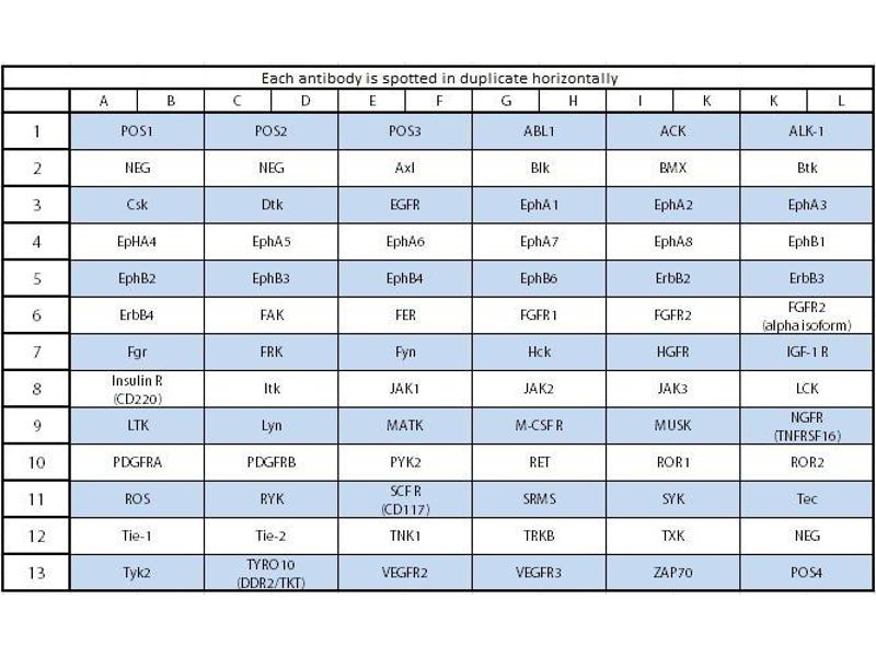 - ABL1, ACK, ALK-1, Axl, Blk, BMX, Btk, Csk, Dtk, EGFR, EphA1, EphA2, EphA3, EphA4, EphA5, EphA6, EphA7, EphA8, EphB1, EphB2, EphB3, EphB4, EphB6, ErbB2, ErbB3, ErbB4, FAK, FER, FGFR1, FGFR2, FGFR2 (alpha isoform), Fgr, FRK, Fyn, Hck, HGFR, IGF-1 R, Insulin R (CD220), Itk, JAK1, JAK2, JAK3, LCK, LTK, Lyn, MATK, M-CSF R, MUSK, NGFR (TNFRSF16), PDGFRA, PDGFRB, PYK2, RET, ROR1, ROR2, ROS, RYK, SCF R (CD117/c-kit), SRMS, SYK, Tec, Tie-1, Tie-2, TNK1, TRKB, TXK, Tyk2, TYRO10 (DDR2/TKT), VEGFR2, VEGFR3