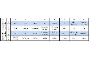 - BFGF, CD40 (TNFRSF5), Eotaxin-1 (CCL11), GCSF, GM-CSF, IFN-gamma, IL-1 alpha (IL-1 F1), IL-1 beta (IL-1 F2), IL-2, IL-3, IL-4, IL-5, IL-6, IL-13, L-Selectin (CD62L), MCP-1 (CCL2), M-CSF, MIP-3 alpha (CCL20), P-Selectin, RANTES (CCL5), TNF alpha, VEGF-A