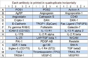 - Activin A, AgRP, Angiogenin, Angiopoietin-1, Angiostatin, Cathepsin S, CD40 (TNFRSF5), Cripto-1, DAN, DKK-1, E-Cadherin, Fas Ligand (TNFSF6), Fc gamma RIIB/C (CD32B/C), Follistatin, Galectin-7, gp130, ICAM-2 (CD102), IL-1 R4 (ST2), IL-13 R alpha 2, IL-13 R1, IL-17B, IL-2 R alpha, IL-2 R beta (CD122), IL-23, LAP/TGF beta 1, NrCAM, PAI-1, PDGF-AB, Resistin, SDF-1 beta (CXCL12 beta), Siglec-5 (CD170), Sonic Hedgehog N-Terminal (Shh-N), TGF beta 2, Thrombopoietin (TPO), Tie-2, TRAIL R4 (TNFRSF10D), TREM-1, TROP1 (EpCAM), VEGF-C, VEGFR1