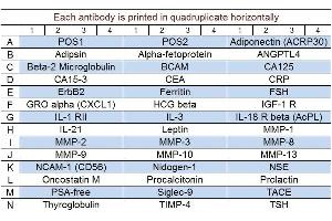 - Adiponectin (ACRP30), Adipsin (Complement Factor D), Alpha-fetoprotein, ANGPTL4, Beta-2 Microglobulin, BCAM, CA125, CA15-3, CEA, CRP (C-Reactive Protein), ErbB2, Ferritin, FSH, GRO alpha (CXCL1), HCG beta, IGF-1 R, IL-1 R2, IL-3, IL-18 R beta (AcPL), IL-21, Leptin, MMP-1, MMP-2, MMP-3, MMP-8, MMP-9, MMP-10, MMP-13, NCAM-1 (CD56), Nidogen-1, NSE, Oncostatin M, Procalcitonin, Prolactin, PSA-free, Siglec-9, TACE, Thyroglobulin, TIMP-4, TSH