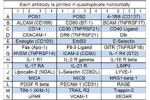 - 4-1BB (TNFRSF9/CD137), ALCAM (CD166), BCMA (TNFRSF17), CD14, CD30 (TNFRSF8), CD40 Ligand (TNFSF5), CD80 (B7-1), CEACAM-1, DR6 (TNFRSF21), Dtk, Endoglin (CD105), ErbB3, E-Selectin, Fas (TNFRSF6/Apo-1), Flt-3 Ligand, GITR (TNFRSF18), HVEM (TNFRSF14), ICAM-3 (CD50), IL-1 R1, IL-1 R4 (ST2), IL-10 R beta, IL-17 RA, IL-2 R gamma (Common gamma Chain), IL-21 R, LIMPII, Lipocalin-2 (NGAL), L-Selectin (CD62L), LYVE-1, MICA, MICB, NRG1-beta 1 (HRG1-beta 1), PDGF R beta, PECAM-1 (CD31), RAGE, TIM-1 (KIM-1), TRAIL R3 (TNFRSF10C), Trappin-2, uPAR, VCAM-1 (CD106), XEDAR