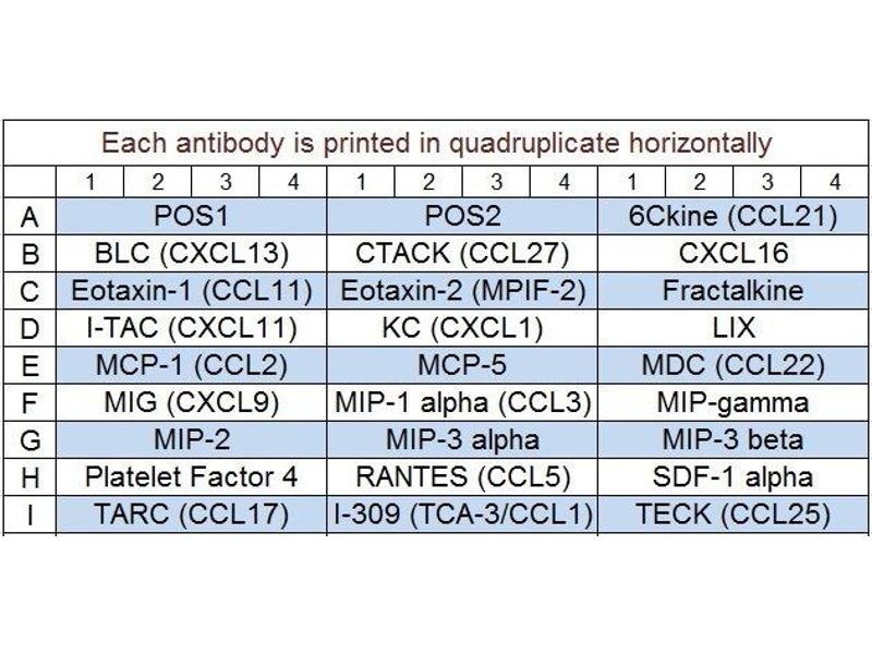 - 6Ckine (CCL21), BLC (CXCL13), CTACK (CCL27), CXCL16, Eotaxin-1 (CCL11), Eotaxin-2 (MPIF-2/CCL24), Fractalkine (CX3CL1), I-309 (TCA-3/CCL1), I-TAC (CXCL11), KC (CXCL1), LIX, MCP-1 (CCL2), MCP-5, MDC (CCL22), MIG (CXCL9), MIP-1 alpha (CCL3), MIP-1 gamma, MIP-2, MIP-3 alpha (CCL20), MIP-3 beta (CCL19), Platelet Factor 4 (CXCL4), RANTES (CCL5), SDF-1 alpha (CXCL12 alpha), TARC (CCL17), TECK (CCL25)