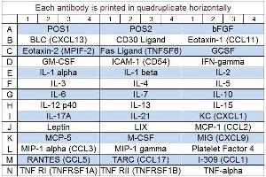 - BFGF, BLC (CXCL13), CD30 Ligand (TNFSF8), Eotaxin-1 (CCL11), Eotaxin-2 (MPIF-2/CCL24), Fas Ligand (TNFSF6), GCSF, GM-CSF, ICAM-1 (CD54), IFN-gamma, IL-1 alpha (IL-1 F1), IL-1 beta (IL-1 F2), IL-2, IL-3, IL-4, IL-5, IL-6, IL-7, IL-10, IL-12 p40, IL-13, IL-15, IL-17A, IL-21, KC (CXCL1), Leptin, LIX, MCP-1 (CCL2), MCP-5, M-CSF, MIG (CXCL9), MIP-1 alpha (CCL3), MIP-1 gamma, Platelet Factor 4 (CXCL4), RANTES (CCL5), TARC (CCL17), I-309 (TCA-3/CCL1), TNF alpha, TNF RI (TNFRSF1A), TNF RII (TNFRSF1B)