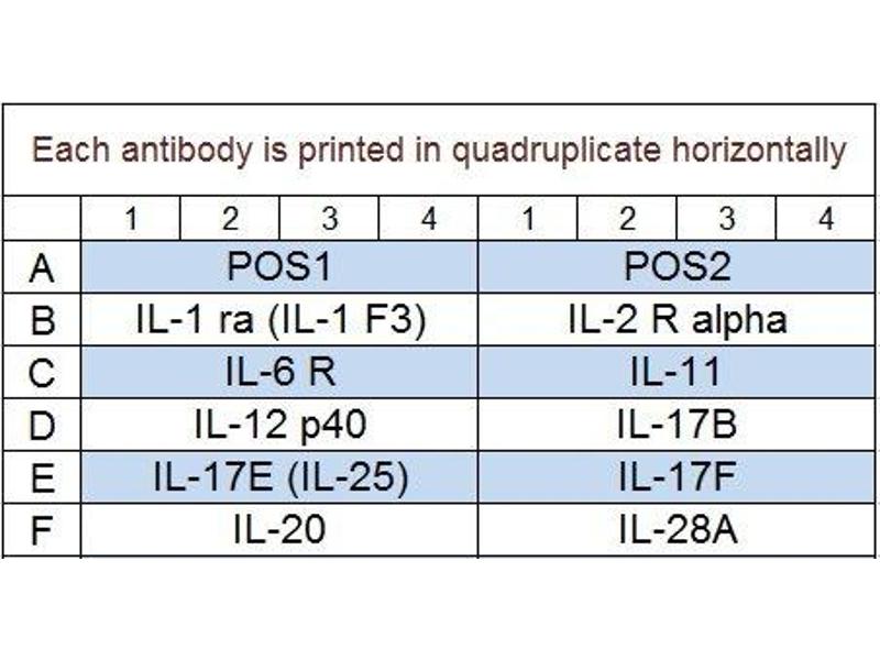 - IL-1 ra (IL-1 F3), IL-2 R alpha, IL-6 R, IL-11, IL-12 p40, IL-17B, IL-17E (IL-25), IL-17F, IL-20, IL-28A (IFN-lambda 2)