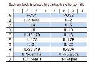- IFN-gamma, IL-1 beta (IL-1 F2), IL-10, IL-12 p70, IL-13, IL-17A, IL-17F, IL-2, IL-21, IL-22, IL-23 p19, IL-28A (IFN-lambda 2), IL-4, IL-5, IL-6, MIP-3 alpha (CCL20), TGF beta 1, TNF alpha