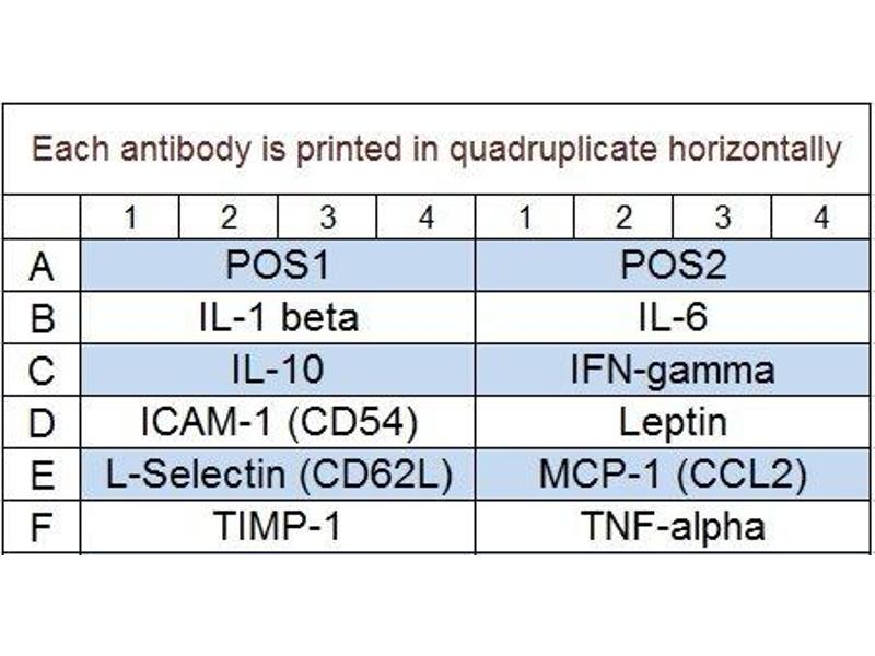 - ICAM-1 (CD54), IFN-gamma, IL-1 beta (IL-1 F2), IL-10, IL-6, Leptin, L-Selectin (CD62L), MCP-1 (CCL2), TIMP-1, TNF alpha