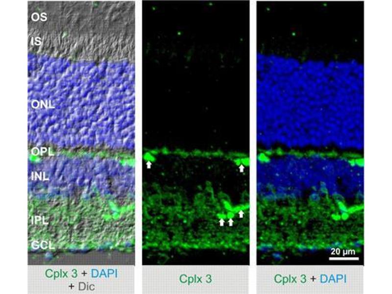 : "The absence of Complexin 3 and Complexin 4 differentially impacts the ON and OFF pathways in mouse retina." in: The European journal of neuroscience, Vol. 36, Issue 4, pp. 2470-81, (2012) (PubMed).Aliases for CPLX3 Antibodies