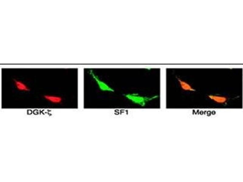 : "Cyclic AMP-stimulated interaction between steroidogenic factor 1 and diacylglycerol kinase theta facilitates induction of CYP17." in: Molecular and cellular biology, Vol. 27, Issue 19, pp. 6669-85, (2007) (PubMed).: "Interaction of gamma 1-syntrophin with diacylglycerol kinase-zeta. Regulation of nuclear localization by PDZ interactions." in: The Journal of biological chemistry, Vol. 276, Issue 28, pp. 26526-33, (2001) (PubMed).