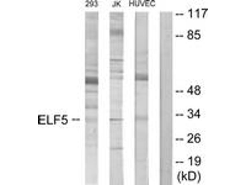 : "Characterization of ESE-2, a novel ESE-1-related Ets transcription factor that is restricted to glandular epithelium and differentiated keratinocytes." in: The Journal of biological chemistry, Vol. 274, Issue 41, pp. 29439-52, (1999) (PubMed).Aliases for ELF5 Antibodies