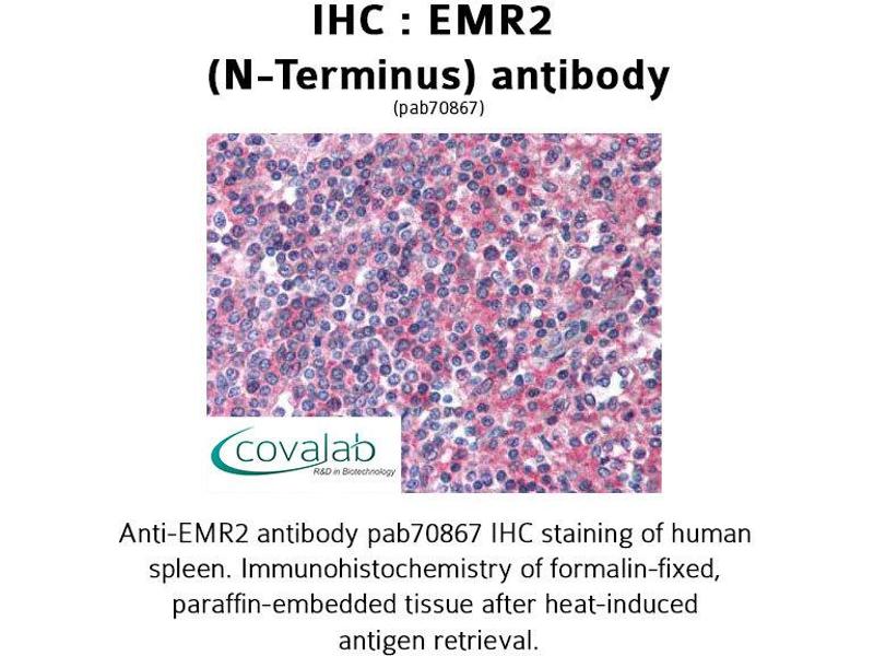 : "The human EGF-TM7 family member EMR2 is a heterodimeric receptor expressed on myeloid cells." in: Journal of leukocyte biology, Vol. 71, Issue 5, pp. 854-62, (2002) (PubMed).