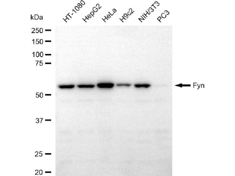 FYN Reactivity: Human, Mouse, Rat, Cow, Dog, Zebrafish (Danio rerio), Pig, Guinea Pig, Horse, Rabbit, Monkey, Bat, Chicken, Xenopus laevis WB Host: Rabbit Polyclonal unconjugated