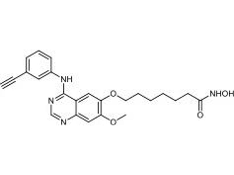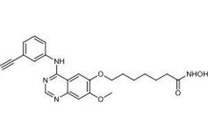 - A novel hybrid dual-acting HDAC and receptor tyrosine kinase inhibitor. It is a potent HDAC inhibitor which also inhibits EGFR and HER2, IC50 = 4.4, 2.4 and 15.7 nM respectively. It not only blocks EGFR and HER2 but also attenuates multiple compensatory pathways such as AKT, HER3 and MET which enable tumor cells to escape the effects of conventional EGFR/HER2 inhibitors.