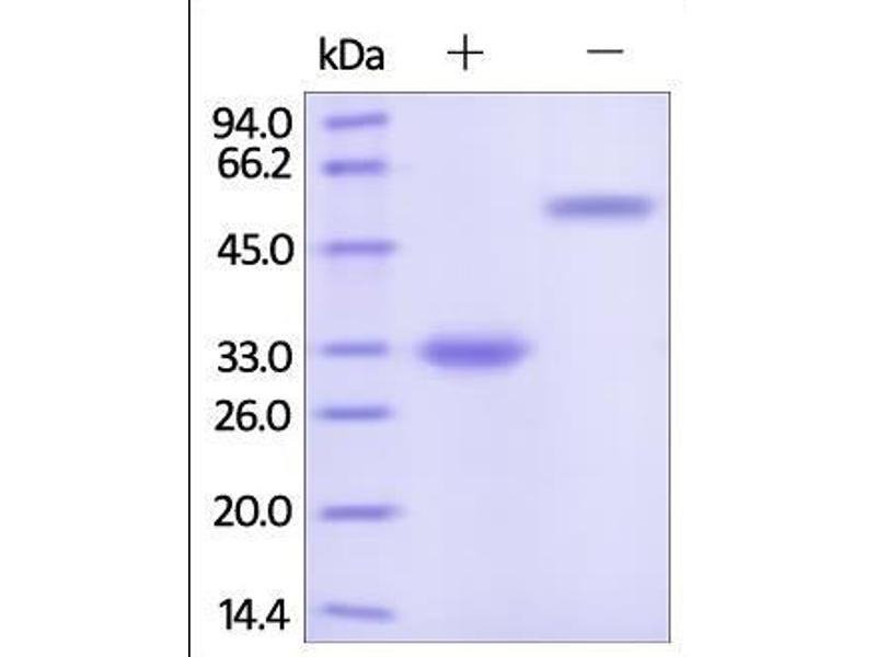 - This protein carries no "tag". The protein has a calculated MW of 25.8 kDa. As a result of glycosylation, the protein migrates as 33-35 kDa under reducing (R) condition, and 50-55 kDa under non-reducing (NR) condition (SDS-PAGE).