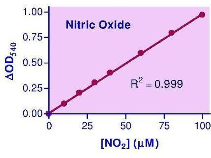 Nitric oxide (NO) is a reactive radical that plays an important role in many key physiological functions. NO, an oxidation product of arginine by nitric oxide synthase, is involved in host defense and development, activation of regulatory proteins and direct covalent interaction with functional biomolecules. Simple, direct and automation-ready procedures for measuring NO are becoming popular in Research and Drug Discovery. Since NO is oxidized to nitrite and nitrate, it is common practice to quantitate total NO2- /NO3- as a measure for NO level. This Nitric Oxide Assay Kit is designed to accurately measure NO production following reduction of nitrate to nitrite using improved Griess method. The procedure is simple and the time required for sample pretreatment and assay is reduced to as short as 30 min.