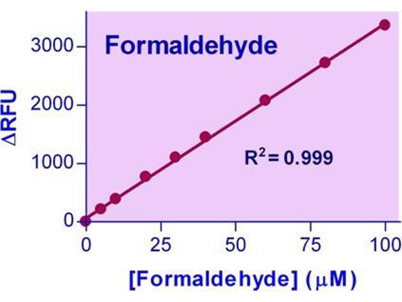 Formaldehyde (methanal) is the simplest aldehyde. It is widely employed in industry for wide range of applications. Formaldehyde is also used as a disinfectant and is a commonly utilized tissue fixative and embalming agent. Formaldehyde is naturally present in all tissues and body fluids. Recently it has been shown that some cancer types exhibit elevated formaldehyde levels. Increased formaldehyde concentration in urine has been associated with prostate and bladder cancer. Thus, measuring formaldehyde in urine can be a very useful tool when studying cancer. This newly designed Formaldehyde Assay Kit provides a convenient fluorimetric means to measure formaldehyde in biological samples. In the assay, formaldehyde is derivatized with acetoacetanilide in the presence of ammonia. The resulting fluorescent product is then quantified fluorimetrically (exc/em = 370/470nm). The assay is simple, sensitive, stable and high-throughput adaptable. The assay can detect as low as 1.5 µM formaldehyde in biological samples.