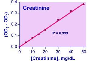 Sensitive and accurate. Use 30 µL samples. Detection limit 0.10 mg/dL (8µM) creatinine in 96-well plate assay.