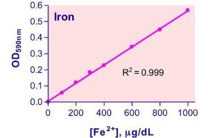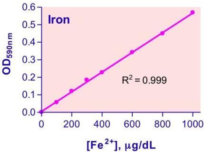 Sensitive and accurate. Linear detection range 27 µg/dL (4.8 µM) to 1,000 µg/dL (179 µM) iron in 96-well plate assay.