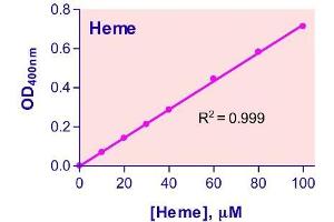 Heme is one important member of the porphyrin family. It is synthesized in both mitochondria and cytoplasm, and is a key prosthetic group for various essential proteins such as hemoglobin, cytochromes, catalases and peroxidases. Heme determination is widely practiced by researchers of various blood diseases. Simple, direct and automation-ready procedures for measuring heme concentration are becoming popular in Research and Drug Discovery. This Heme Assay Kit is based on an improved aqueous alkaline solution method, in which the heme is converted into a uniform colored form. The intensity of color, measured at 400 nm, is directly proportional to the heme concentration in the sample. The optimized formulation substantially reduces interference by substances in the raw samples and exhibits high sensitivity.