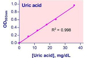 Sensitive and accurate. Use 5 µL samples. Linear detection range 0.22 mg/dL (13µM) to 30 mg/dL (2380µM) uric acid in 96-well plate assay.