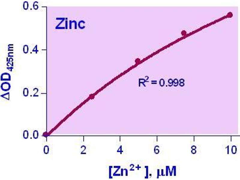 Sensitive and accurate. Uses 50 µL samples. Linear detection range 0.12 µM (0.78 µg/dL) to 10 µM (65 µg/dL) zinc in 96-well assay format.