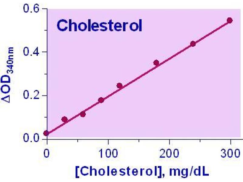 Cholesterol is a sterol and lipid present in the cell membranes, and is transported in the bloodstream of all animals. It is used to form cell membranes and hormones, and plays important roles in cell signaling processes. Elevated levels (hypercholesterolemia) have been associated with cardiovascular diseases such as atherosclerosis, whereas, low levels (hypocholesterolemia) may be linked to depression, cancer and cerebral hemorrhage. Simple, direct and automation-ready procedures for measuring cholesterol are very desirable. This Cholesterol Assay is based on cholesterol esterase hydrolysis of cholesterol esters to form free cholesterol and cholesterol dehydrogenase catalyzed conversion of cholesterol to cholest-4-ene- 3-one, in which NAD is reduced to NADH. The optical density of the formed NADH at 340 nm is directly proportionate to the cholesterol concentration in the sample.