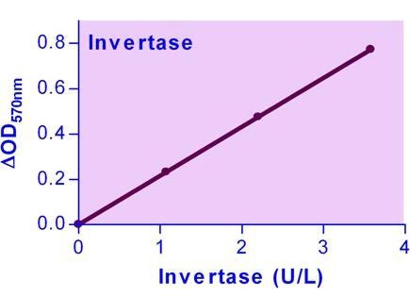 Invertase (beta-fructofuranosidase, EC 3.2.1.26) is an enzyme that catalyzes the hydrolysis of sucrose to fructose and glucose. Invertases cleave at the O-C(fructose) bond, whereas a related enzyme sucrase (EC 3.2.1.48) cleaves at the O-C(glucose) bond. A wide range of microorganisms produce invertase and can, thus, utilize sucrose as a nutrient. Invertase assay finds wide applications in environmental (e.g. soil), agricultural and food (confectionery) industry. This Invertase Assay Kit provides a convenient and ultra-sensitive colorimetric and fluorimetric means to measure invertase activity. In the assay, invertase cleaves sucrose, resulting in the formation of fructose and glucose, which is determined by a colorimetric (570nm) or fluorimetric method (gamma em/ex = 585/530nm). The assay is simple, sensitive, stable and high-throughput adaptable.