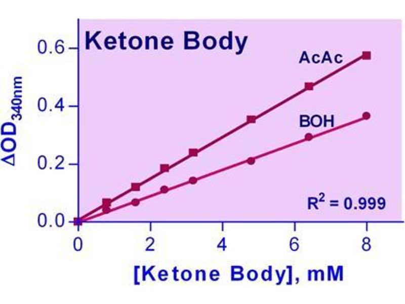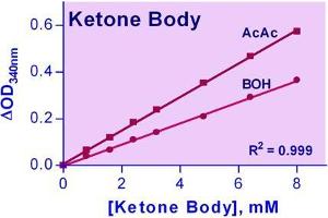Ketone Bodies (acetoacetic acid and 3-hydroxybutyric acid) are produced in the liver mainly from oxidation of fatty acids, and are normally present at low concentrations in urine and blood. Increased ketone concentrations in the blood may lead to metabolic acidosis, which has been associated with diabetes, childhood hypo-glycaemia, growth hormone deficiency, alcohol or salicylate intoxication and inborn errors of metabolism. Simple, direct and automation-ready procedures for measuring acetoacetic acid (AcAc) and 3-hydroxybutyric acid (BOH) are very desirable. This ketone body assay is based on 3-hydroxybutyrate dehydrogenase catalyzed reactions, in which the change in NADH absorbance, measured at 340nm, is directly related to the AcAc and BOH concentrations.