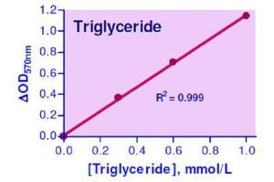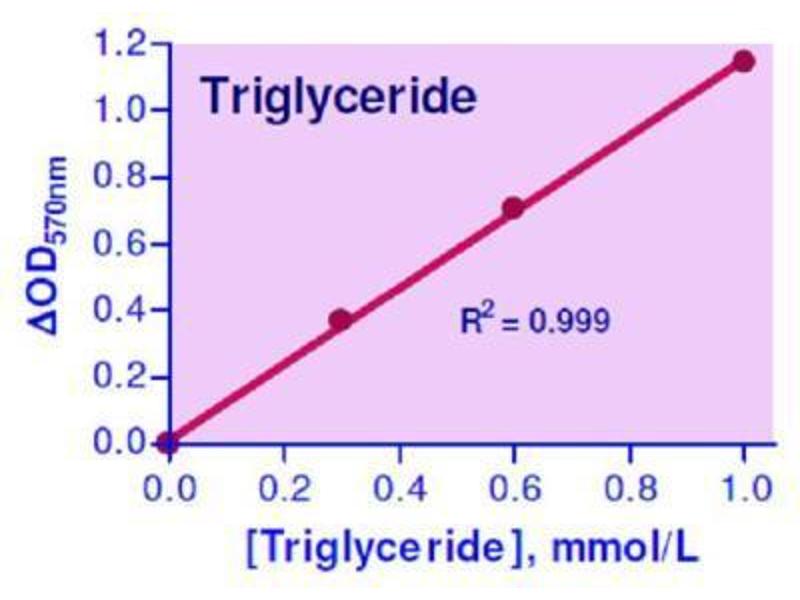 Triglyceride, also known as Triacyltriglyceride or Triacyl-Glyceride, is the main constituent in vegetable oil and animal fats. Triglycerides play an important role as energy sources and transporters of dietary fat. In the human body, high levels of triglycerides in the bloodstream have been linked to atherosclerosis, heart disease and pancreatitis. Simple, direct and automation-ready procedures for measuring triglyceride concentrations find wide applications in research and drug discovery. This triglyceride assay uses a single Working Reagent that combines triglyceride hydrolysis and glycerol determination in one step, in which a dye reagent is oxidized to form a colored product. The color intensity at 570nm is directly proportional to triglyceride concentration in the sample.