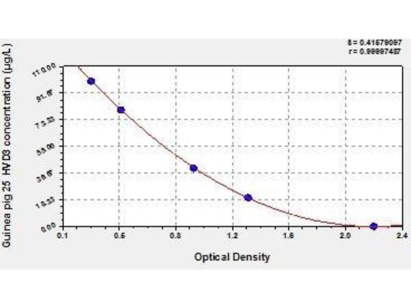 Create a standard curve by reducing the data using computer software capable of generating a four parameter logistic (4-PL) curve fit. As an alternative, construct a standard curve by plotting the mean absorbance for each standard on the x-axis against the concentration on the y-axis and draw a best fit curve through the points on the graph. The data may be linearized by plotting the log of the target antigen concentration versus the log of the O.D. and the best fit line can be determined by regression analysis. This procedure will produce an adequate but less precise fit of the data.