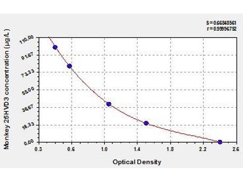 Create a standard curve by reducing the data using computer software capable of generating a four parameter logistic (4-PL) curve fit. As an alternative, construct a standard curve by plotting the mean absorbance for each standard on the x-axis against the concentration on the y-axis and draw a best fit curve through the points on the graph. The data may be linearized by plotting the log of the target antigen concentration versus the log of the O.D. and the best fit line can be determined by regression analysis. This procedure will produce an adequate but less precise fit of the data.