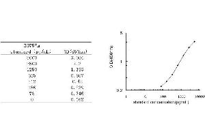- The microtiter plate provided in this kit has been pre-coated with an antibody specific to the target. Standards or samples are then added to the appropriate microtiter plate wells with a biotin-conjugated polyclonal antibody preparation specific for target and Avidin conjugated to Horseradish Peroxidase (HRP) is added to each microplate well and incubated. Then a TMB (3,3'5, 5' tetramethyl-benzidine) substrate solution is added to each well. Only those wells that contain the target, biotin-conjugated antibody and enzyme-conjugated Avidin will exhibit a change in color. The enzyme-substrate reaction is terminated by the addition of a sulphuric acid solution and the color change is measured spectrophotometrically at a wavelength of 450 nm ± 2 nm. The concentration of target in the samples is then determined by comparing the O.D. of the samples to the standard curve.