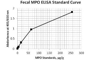 - This ELISA kit is designed, developed and produced for the quantitative measurement of human myeloperoxidase in stool samples. The assay utilizes the two-site sandwich technique with selected antibodies that bind to different epitopes of myeloperoxidase.Assay standards, controls and extracted patient samples are added directly to wells of a microtiter plate that is coated with antibody to myeloperoxidase. After an incubation period, the plate is washed and horseradish peroxidase (HRP)-conjugated human myeloperoxidase antibody is added to each well. After the second incubation period, a sandwich of solid-phase monoclonal antibody human myeloperoxidase HRP-conjugated antibody is formed. The unbound antibodies and buffer matrix are removed in the subsequent washing step. For the detection of this immunocomplex, the well is then incubated with a substrate solution in a timed reaction and the absorbances are then measured in a spectrophotometric microplate reader. The enzymatic activity of the immunocomplex bound to the wall of each microtiter well is directly proportional to the amount of human myeloperoxidase in the test sample. A standard curve is generated by plotting the absorbance versus the respective human myeloperoxidase concentration for each standard on a point-to-point or 4-parameter curve fitting. The concentration of human myeloperoxidase in test samples is determined directly from this standard curve.
