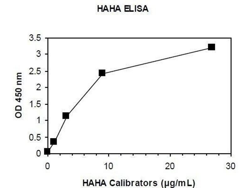 - Assay standards, controls and patient samples are directly added to wells of a microplate that is coated with highly purified human IgG. After the first incubation period, the HAHA binds to the human IgG on the wall of microtiter well and unbound proteins in each microtiter well are washed away. Then a horseradish peroxidase (HRP)-labeled human antibody is added to each microtiter well and a sandwich of well coated human IgG HAHA HRP-Conjugated human antibody is formed. The unbound HRP conjugated human antibody is removed in the subsequent washing step. For the detection of this immunocomplex, the well is then incubated with a substrate solution in a timed reaction and then measured in a spectrophotometric microplate reader. The enzymatic activity of the immunocomplex bound to HAHA on the wall of the microtiter well is directly proportional to the amount of HAHA in the sample. A standard curve is generated by plotting the absorbance versus the respective HAHA concentration for each standard on point-to-point or 4 parameter curve fit. The concentration of HAHA in test samples is determined directly from this standard curve.