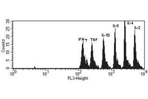 - Reagents for capture and detection of IL-2, IL-4, IL-6, IL-10, TNF, and IFN-gamma, wash buffer, assay diluent, serum enhancement buffer, cytometer setup reagents