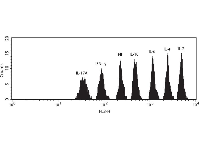 - Reagents for capture and detection of IL-2, IL-4, IL-6, IL-10, TNF, IFN-gamma, and IL-17A, wash buffer, assay diluent, serum enhancement buffer, cytometer setup reagents