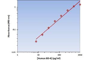 - The Human BD-4 ELISA Kit allows for the detection and quantification of endogenous levels of natural and/or recombinant Human BD-4 proteins within the range of 8-1000 pg/mL.