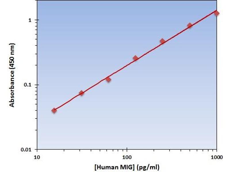 - This particular immunoassay utilizes the quantitative technique of a Sandwich Enzyme-Linked Immunosorbent Assay (ELISA) where the target protein (antigen) is bound in a sandwich format by the primary capture antibodies coated to each well-bottom and the secondary detection antibodies added subsequently by the investigator. The capture antibodies coated to the bottom of each well are specific for a particular epitope on the Human MIG cytokine while the user-added detection antibodies bind to epitopes on the captured target protein. Amid each step of the procedure, a series of wash steps must be performed to ensure the elimination of non-specific binding between proteins to other proteins or to the solid phase. After incubation and sandwiching of the target antigen, a peroxidase enzyme is conjugated to the constant heavy chain of the secondary antibody (either covalently or via Avidin/Streptavidin-Biotin interactions), allowing for a colorimetric reaction to ensue upon substrate addition. When the substrate TMB (3, 3’, 5, 5’- Tetramethylbenzidine) is added, the reaction catalyzed by peroxidase yields a blue color that is representative of the antigen concentration. Upon sufficient color development, the reaction can be terminated through addition of Stop Solution (2 N Sulfuric Acid) where the color of the solution will turn yellow. The absorbance of each well can then be read by a spectrophotometer, allowing for generation of a standard curve and subsequent determination of protein concentration.